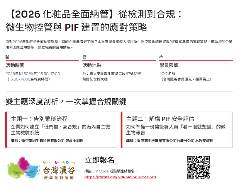 下午於台北舉辦【2026 化粧品全面納管】從檢測到合規:微生物控管與 PIF 建置的應對策略課程